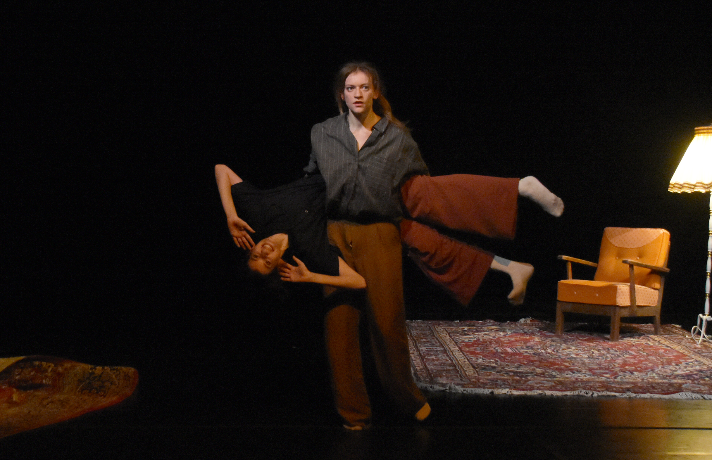 Zwischen grimassierender Komik, Groteske und Vorsicht fand in „Unbind“ von Simone Elliott eine sukzessive Annäherung zweier Frauen statt. In klischeehaftem Nachkriegsambiente mit Nierentisch und Stehlampe begegnen sich die Tänzerinnen zu schnulziger Musik im Wohnzimmer und öffnen sich nach und nach. Dabei entdeckten sie eine unerwartete und neue Nähe, die zunächst auch verunsichert und Angst machte, was sich in bizarr verzerrtem Puppenlachen äußerte. Auch wenn die Tänzerinnen/Frauen bei ihrem manchmal komischen Stolpern daneben griffen oder in den Armen der anderen querlagen, fanden sie zur Freiheit und einem starken Ausdruck zugewandter Verbundenheit.