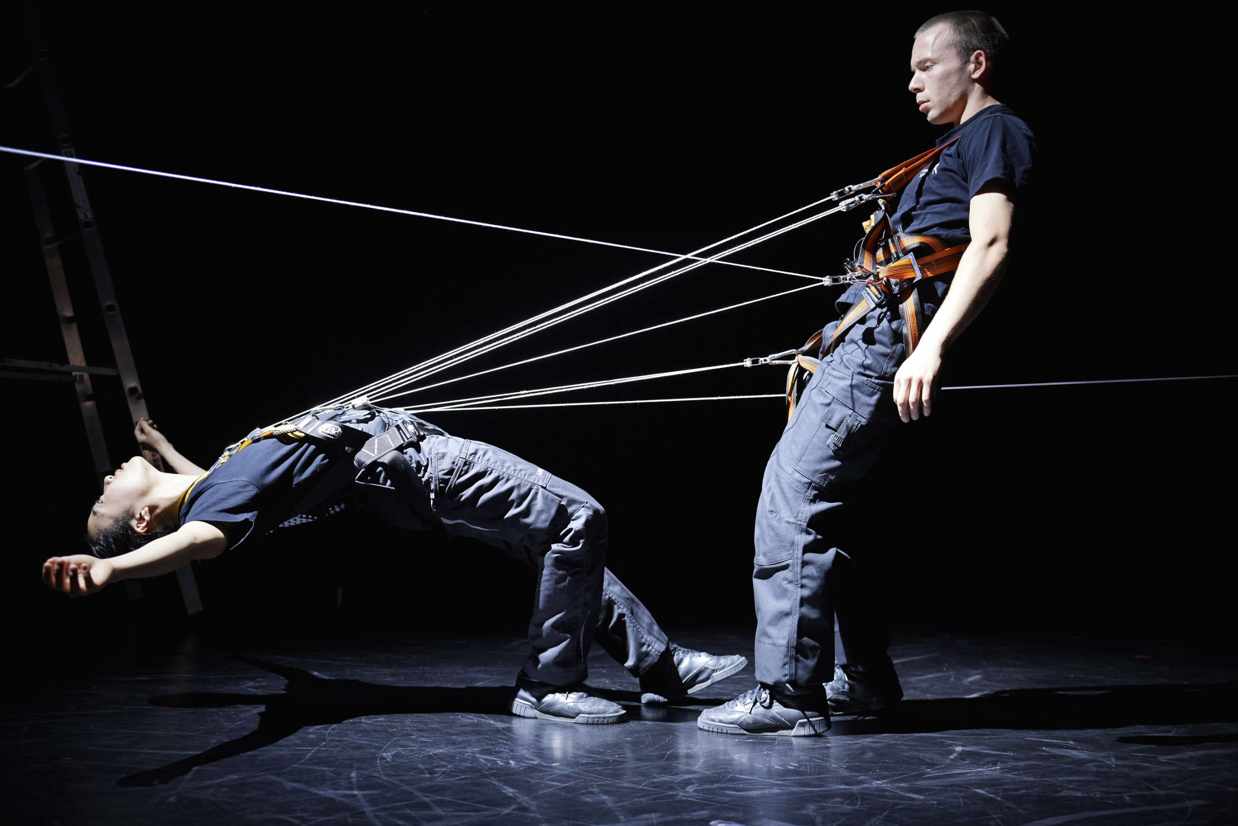 Mit Putzeimern und Leitern rückt Win McCain in seiner dynamischen Auseinandersetzung „Technical diffculties“ die Menschen hinter der Bühne ins Zentrum. An Seilzügen hängen Natsuho Matsumoto und Vincent Wodrich, geführt, gehalten, gelenkt und vielleicht auch manipuliert von Chih-Yuan Yang, Win McCain, Fatima Lopez Garcia und Bérénice Durozey. Unterlegt von einem englischen Text und düsterer Musik ist es eines der spannendsten Stücke im wahnwitzigen Bemühen zueinander zu kommen, auseinandergerissen zu werden und schließlich von den Fesseln befreit alleine zu sein.