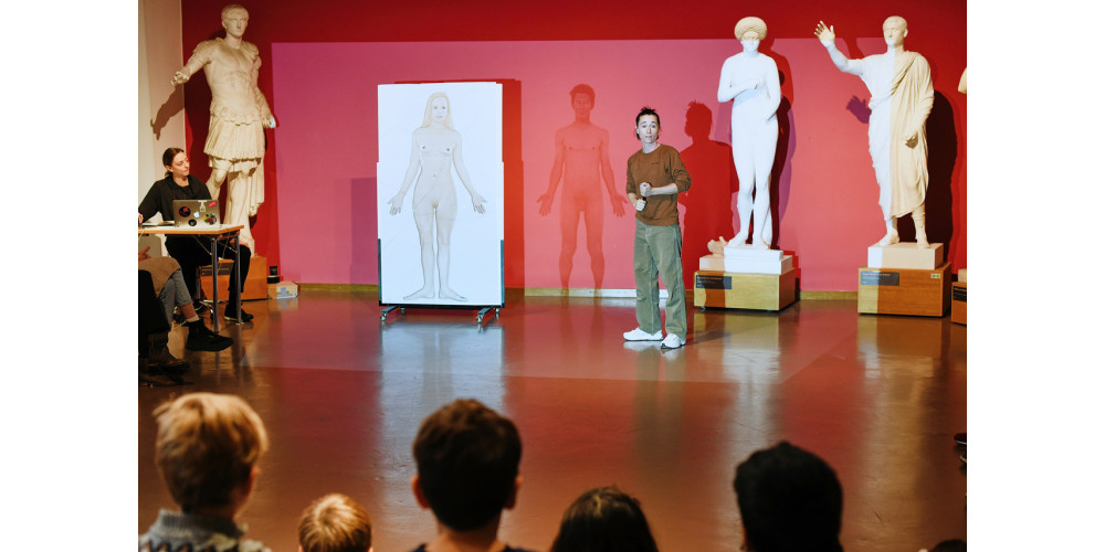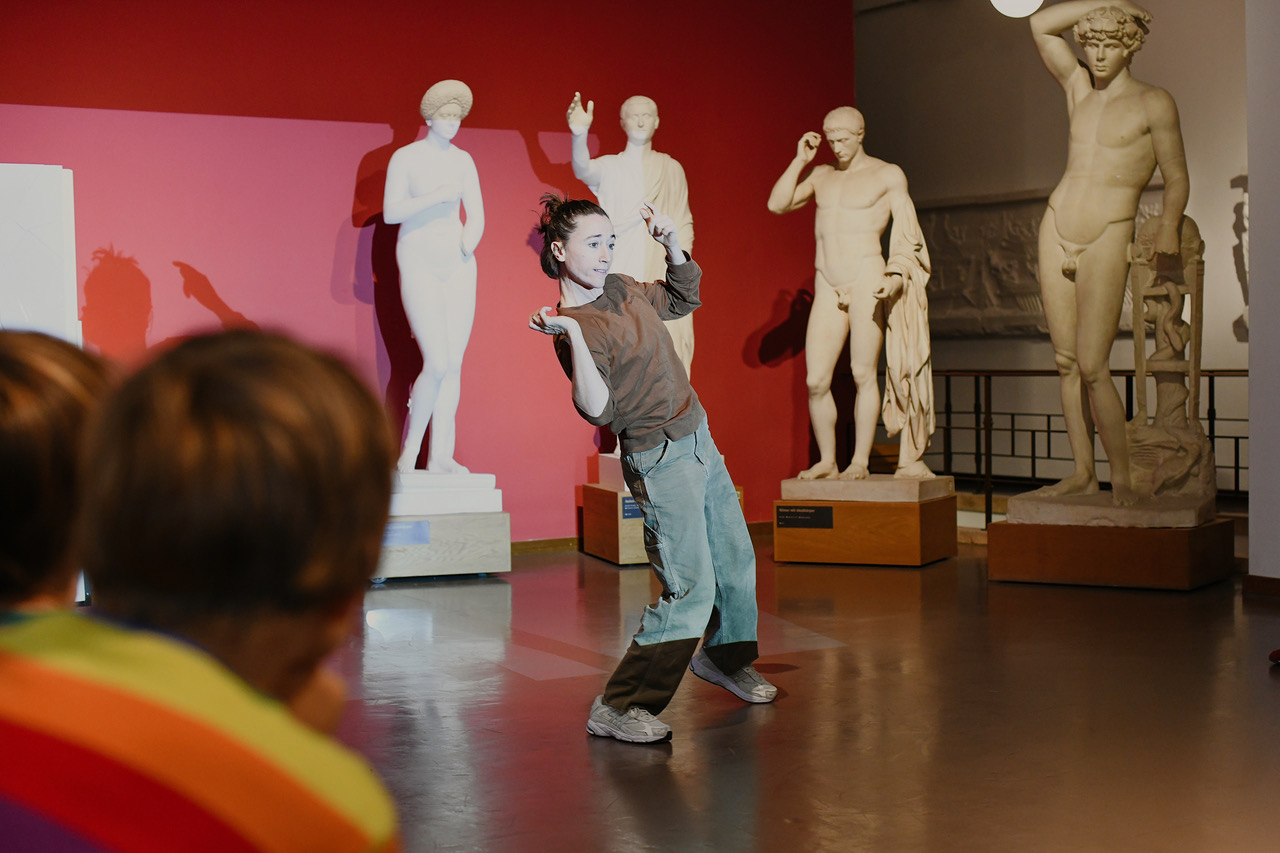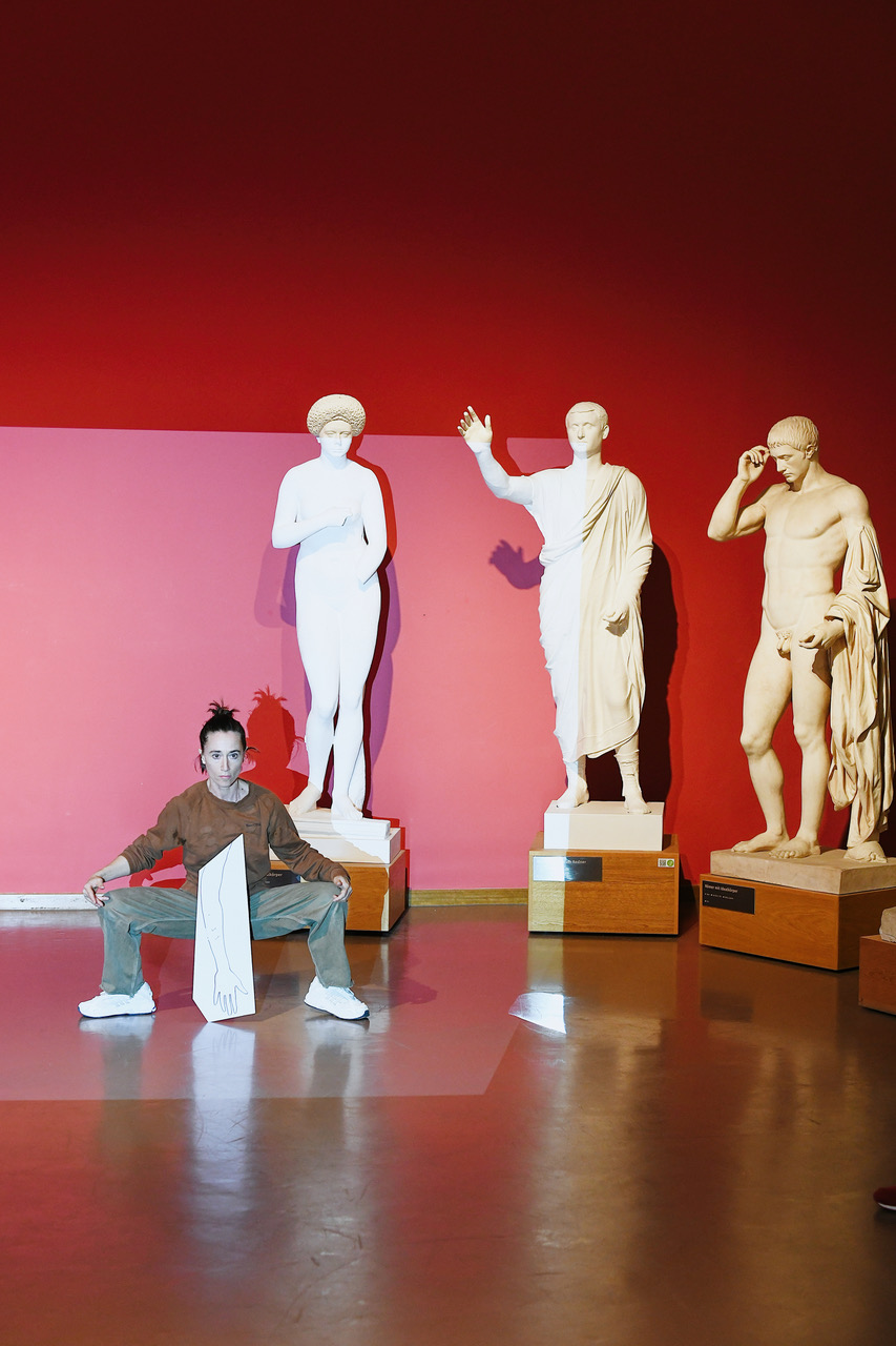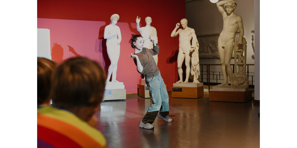 Einen geeigneteren Ort für Sahra Hubys Tanzprojekt „Hey Körper?!“ als das „Museum für Abgüsse Klassischer Bildwerke“ in München kann man sich kaum vorstellen. Wenngleich die Figuren bzw. Gipsabgüsse von Skulpturen der griechischen und römischen Antike aus konservatorischen Gründen nur die Kulisse bilden, so dienen sie doch als Inspirationsquelle für die Darstellung und Wahrnehmung des menschlichen Körpers, dem Thema dieses Abends, das Huby auch auf ihrer anschaulichen Website thematisiert, wobei sie versucht unser Verständnis des menschlichen Körpers zu erweitern.