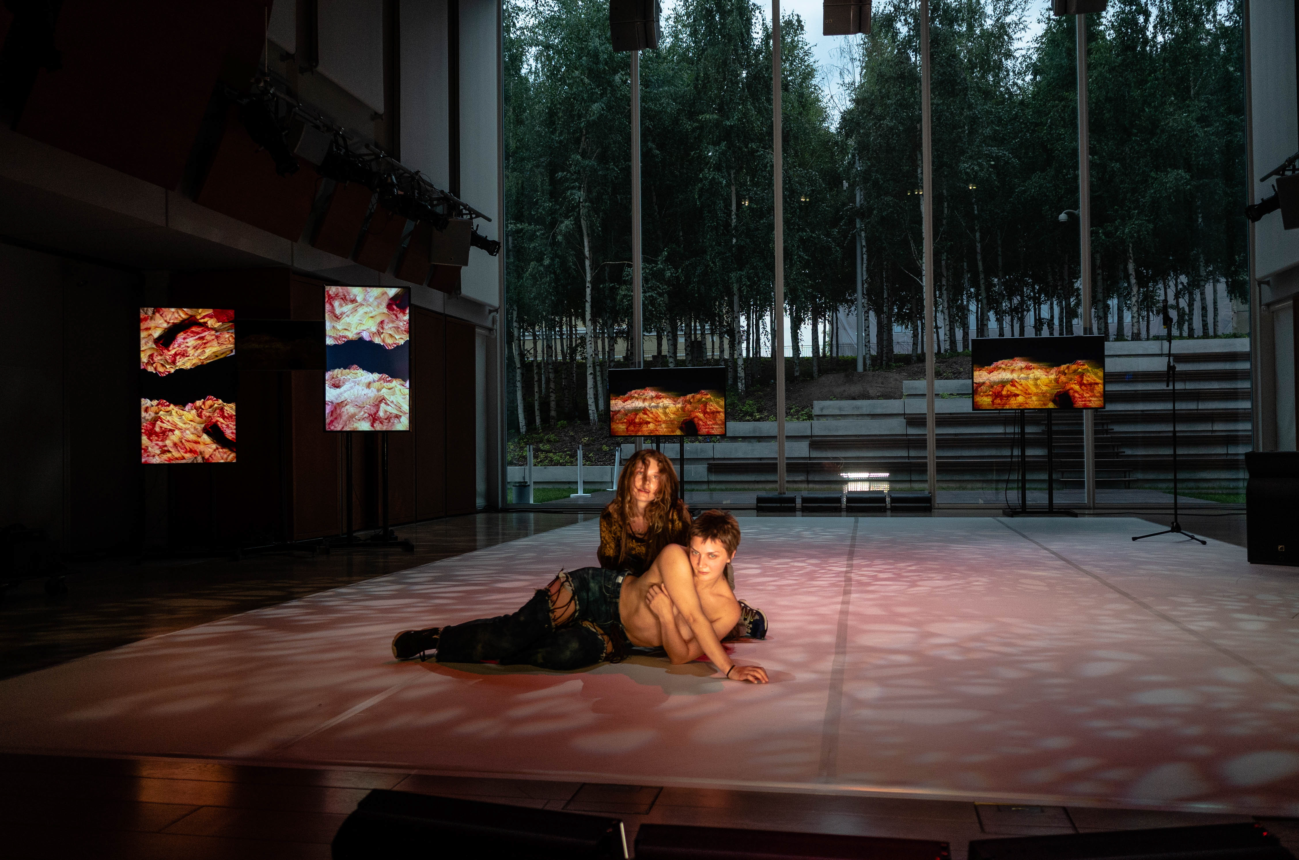 Doch das ist es noch nicht ganz – mit technisch verzerrter Stimme wird das Publikum dazu aufgefordert, sich gemeinsam mit den Performerinnen in das Foyer zu begeben. Dort wird die für Belyagina typische, ganzheitliche Nutzung des Theaterraums noch einmal verdeutlicht: Schon im Bühnenraum wurden auch die Wände und die Traversen der Lichttechnik bespielt, im Foyer nun werden Pflanzen, Sofas und die Bar miteinbezogen – bis die beiden Performerinnen plötzlich durch eine der Türen verschwinden.