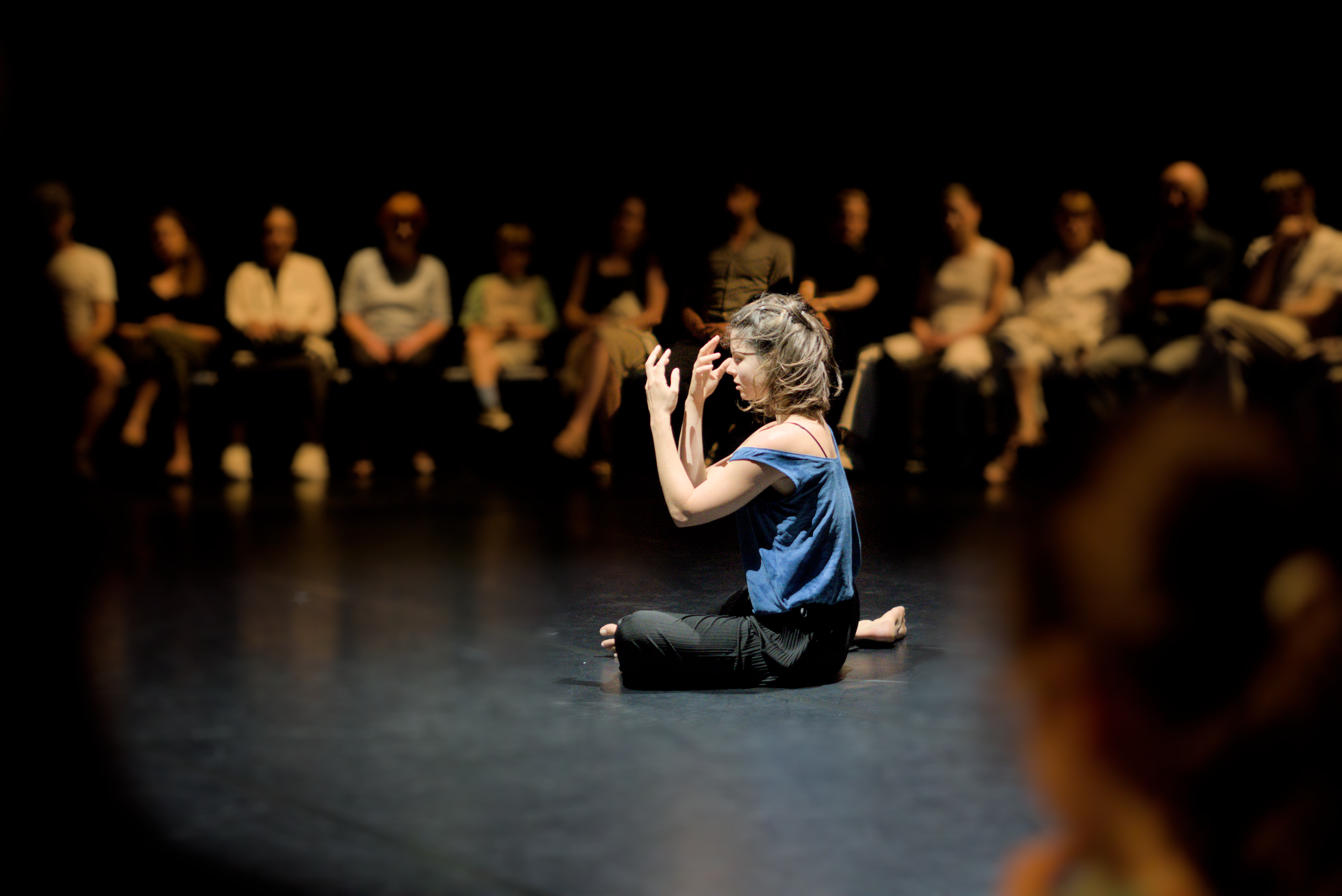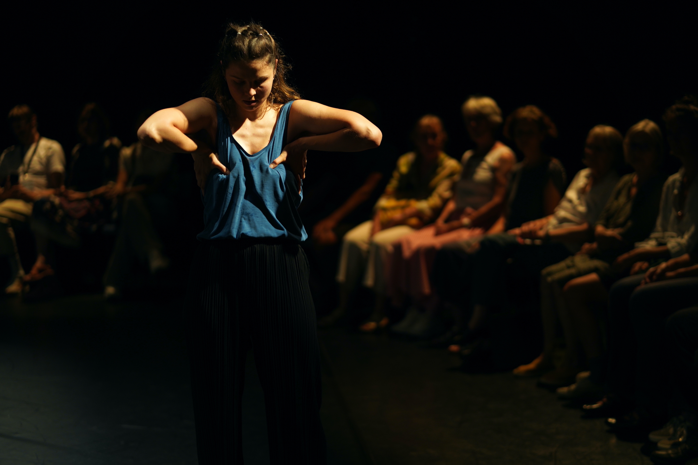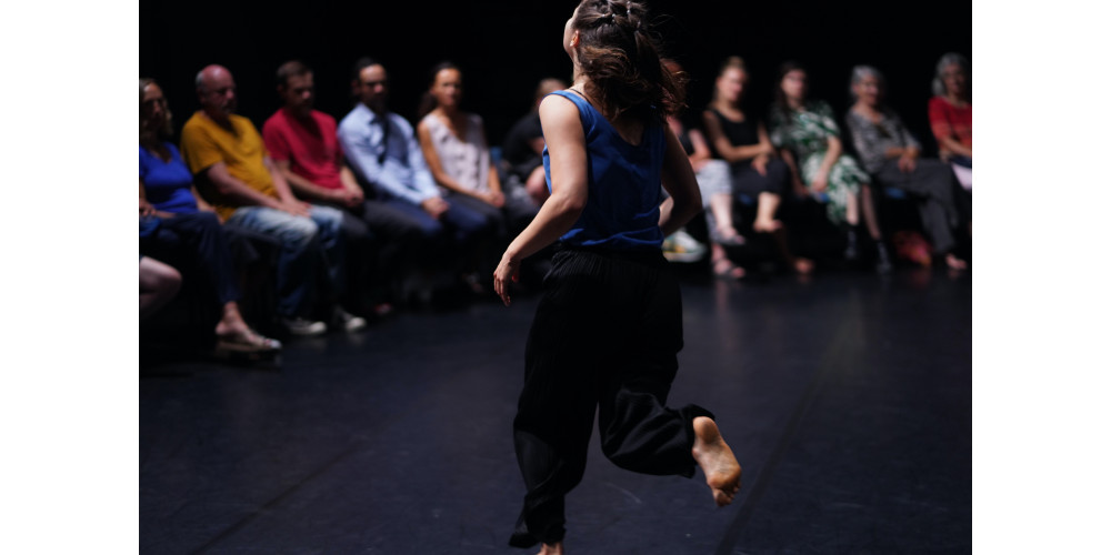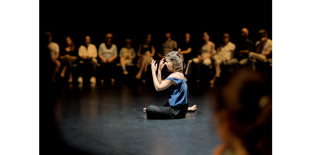 Zuvor hat das Publikum im Kreis auf Stühlen und davor ausgelegten Kissen Platz genommen. Anders als bei Felix Ruckerts „Ring“ – der 25 Jahre alten Eröffnung der diesjährigen Tanzwerkstatt Europa – blicken die Zuschauer*innen hier in den Kreis hinein statt heraus. Suchende Blicke schweifen an den Sitzenden entlang. Wo und wie wird Jovana Zelenović – eine tolle, beeindruckend feinfühlige Tänzerin – die Arena betreten? Erwartungsvolle Stille macht sich in dem von oben angenehm ausgeleuchteten Bühnenraum breit. Inmitten des Publikums spreizt sich ein nackter Fuß. Geradezu butohesk ist er nach innen verbogen. Langsam und extrem angespannt wie unter spastischen Krämpfen arbeitet sich ein Bein hoch in die Luft. Langsam gerät der Körper der 1996 in Belgrad geborenen Tänzerin in Bewegung. Das Unerklärbare bricht schleichend aus ihr heraus und verwandelt sie in ein oszillierendes Wesen: getrieben, suchend – im Spannungsfeld von zwanghaften Stereotopyen, Wut, Trauer, Verzweiflung, Schuld, Ohnmacht, Hyperaktivität und Furcht bis hin zur Isolation. Die Glieder wollen ihr nicht mehr richtig gehorchen. Ihre Arme verdrehen sich auf die unnatürlichste Weise. Jovana Zelenović wird zum Vexierbild eines schweren Traumas. Sie ist nicht mehr Herrin über sich selbst und kippt seitlich vom Stuhl, was ihre Sitznachbarin in Bedrängnis bringt. Wie geht man um mit solchen Situationen?