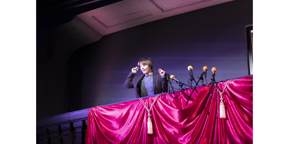 Vor Beginn der Aufführung erhält das Publikum von Beate Höhn einen gutgemeinten Ratschlag. „Blicken Sie in Richtung der Lichtquelle“, sagt die Nürnberger Choreografin, die die multimediale Performance „confused + affected“ gemeinsam mit dem Münchner Künstler Micha Purucker entwickelt hat, und fährt fort: „Sie können Abstand halten oder ganz nah an die dreizehn Performer und Performerinnen herangehen, das bleibt ihnen überlassen“. Anschließend öffnen sich die Türen des neu renovierten Festsaals im Künstlerhaus. Sechs lange Jahre war dieser geschlossen, nun steht man in einem leer geräumten schwarzen Kubus und blickt in die Höhe. An einer der Wände gibt es eine Balustrade, über die ein rotes Tuch gespannt ist. Man sieht Mikrofone, dahinter steht eine Performerin. Sie spielt einen Politiker, der eine Rede hält. Sie winkt den Anhängern zu, macht eine Geste, als würde sie alle umarmen wollen. Dann ballt sie auf einmal die Faust und schneidet Fratzen.
