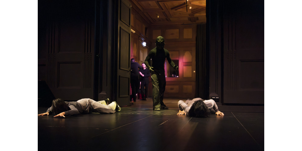 Bei der ersten Station konnte man gar nicht anders als an einen hasserfüllten Politiker vom Schlage Donald Trumps zu denken. Auch die zweite Station erklärt sich mehr oder weniger von selbst. Auf dem Kamin des Kleinen Saals steht ein Bild, das zwei Schwarze Migranten zeigt, die über einen Stacheldrahtzaun klettern, um nach Spanien zu gelangen. Ein Polizist der Guardia Civil will sie daran hindern. Am Kamin stehen zwei Männer, der eine ist weiß, der andere Schwarz, und stoßen miteinander an. Nur um sich dann die Sakkos auszuziehen und in der Raummitte aufeinander loszugehen. Bei den beiden Ringern handelt es sich um professionelle Kampfkünstler, ihr Fight schaut echt und brutal aus. Das ändert aber nichts daran, dass die Idee, einen Kampf als Allegorie auf die Flüchtlingskrise zu zeigen, allzu plakativ ist.