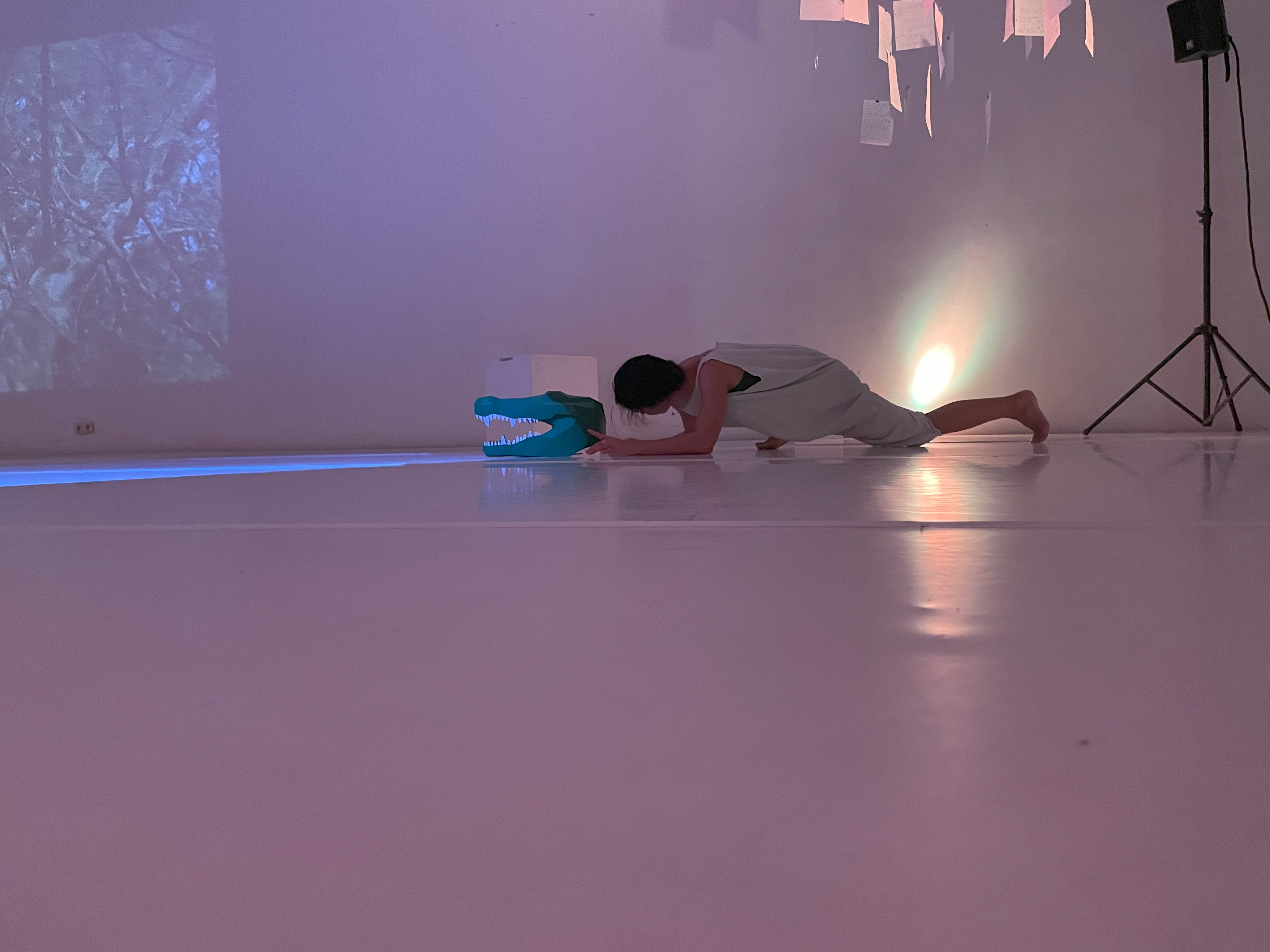 Und dann ist da das Krokodil: Es begegnet uns sowohl in einer Fotocollage an der Wand als auch in einem Krokodilkopf aus Pappmache, den Cristina D´Alberto in der Mitte der Performance aufsetzt. Zu dieser symbolischen Figur wurde die Performerin von Jaques Lacans psychologischer Theorie vom Archetyp der Krokodilmutter inspiriert, die in einem Akt ultimativer Besitzergreifung ihre eigenen Kinder angeblich auffrisst. (Tatsächlich fressen Krokodile ihre Kinder nicht.) „We all have also the crocodile mother in us“, sagt D´Alberto und wirft so die Frage in den Raum, wie sich mit den besitzergreifenden und ängstlichen Emotionen umgehen lässt, die Mutterschaft mit sich bringt.