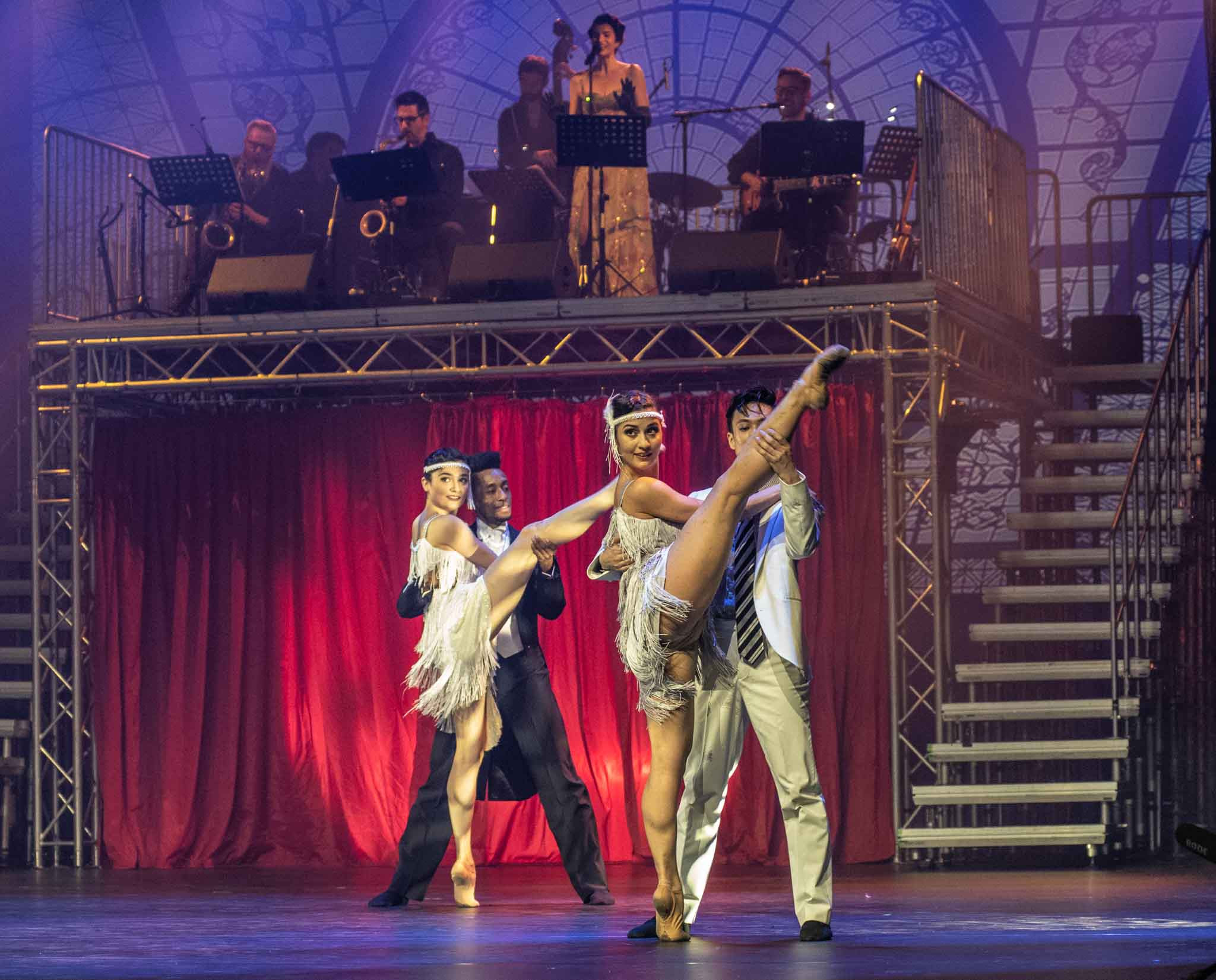 Enrique Gasa Valga, ehemaliger Tänzer beim Kubanischen Nationalballett und Leiter der Tanzcompany des Tiroler Landestheaters, hat eine mitreißende Show mit passenden Lichteffekten kreiert und auf die Beine gestellt, die nur so gut sein kann wie ihre Darsteller*innen. Genau darauf kann sich der spanische Choreograf verlassen: Sein Ensemble, die ‚Limonada Dance Company‘ ist in der Lage, Ballett, Stepptanz, Akrobatik und Jazz sowie Charleston in atemberaubender Geschwindigkeit, Wechsel und Präzision auf die Bühne zu bringen – analog zum pulsierenden Leben der 1920er Jahre, zu Gatsbys innerlicher Unruhe, seiner unaufhörlichen Jagd nach gesellschaftlicher Anerkennung, um Daisy zu beeindrucken. Sofort drängt sich die Frage auf, ob sich der ‚American Dream‘ vom Tellerwäscher zum Millionär hier erfüllt. Hervorragend verkörpert Mark Biocca den coolen Gatsby, der im Stepptanz genauso sattelfest ist wie im Gesang. Stimmlich herausragend ist Greta Marcolongo, darstellerisch und tänzerisch Camilla Danesi als die kokette Daisy und Addiso Ector in der Rolle von Nick Carraway. Chapeau an Musiker*innen, Ensemble und Solist*innen, die im besten Sinne harmonierten.