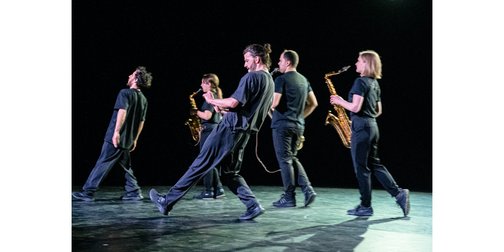 Plätze werden getauscht und die Tänzer sind plötzlich von je zwei Musikern eingerahmt, auf deren Schultern sie sich aktiv hochspringend stützen oder zwischen denen sie kurz mal wie entkräftet hängen. Wenig später zirkeln alle gemeinsam wieder in einer geraden Linie durch den schlicht schwarzen Raum.