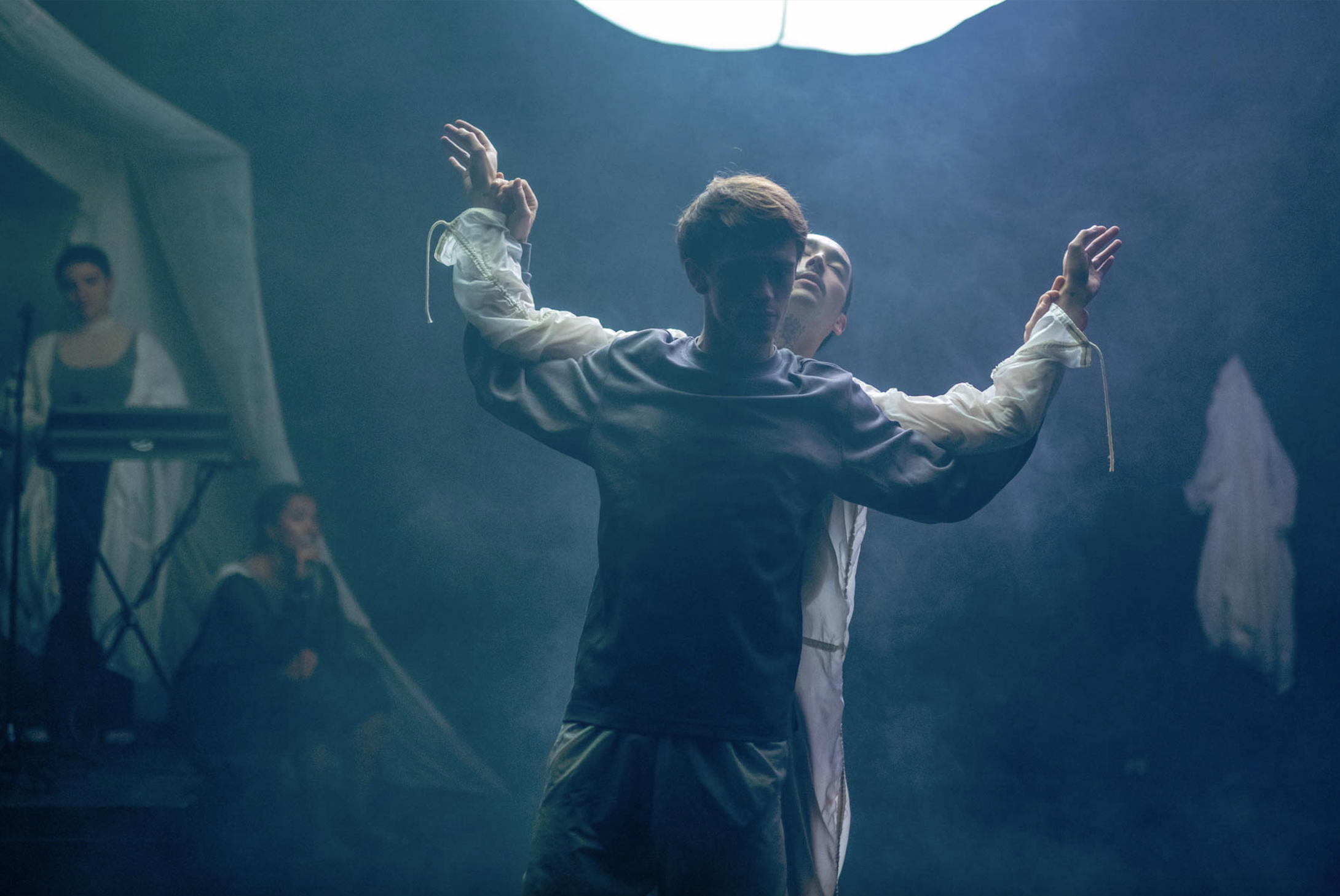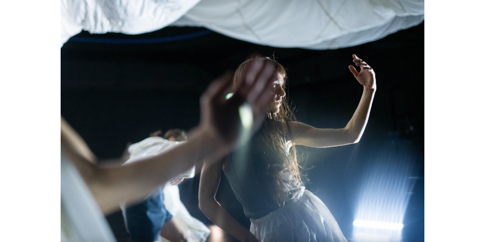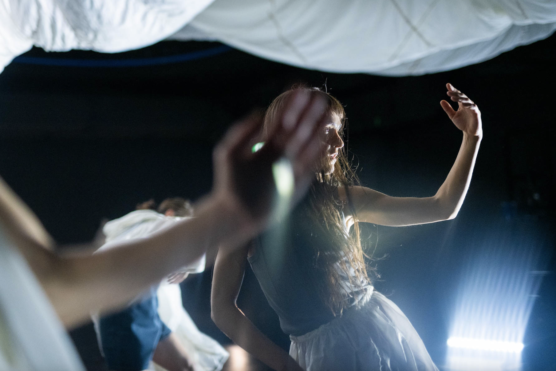 Auf dunkler Bühne unter einer Art Zeltplane im Hintergrund drängen sich anfangs bloß schemenhaft erkennbar die Protagonist*innen. Von der Decke herab hängen wolkig gebauscht durchscheinend dünne weiße Stoffplanen. Lange Kapuzenumhänge sind an der Rückwand zu erkennen und werden bereits von einzelnen Tänzer*innen getragen. Langsam zu summenden Klängen der Live-Band, die sich immer stärker in die Performance einbringt, beginnen ihre Körper zu schwingen. Unter dem Podium schwappt eine erste bodennahe Welle Trockeneis-Nebel Richtung Publikum. „We are the dreamers of our lives“ lautet Lukas Bamesreiters erste für diesen Abend geschriebene Liedzeile. Danach erobert das Tanzkollektiv individuell impulsiv allmählich die freie Fläche im Vordergrund für sich, wobei ihr Augenmerk zu Beginn allein auf das Musikertrio gerichtet ist. Das Publikum als Adressat für eine Arbeit, die laut Programmzettel „das Verständnis von Normalität und Abweichung neu definiert“, rückt erst allmählich in den Mittelpunkt der wie ein Konzert mit eingeschworener Fangemeinde inszenierten Show.