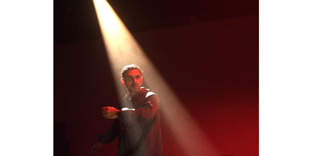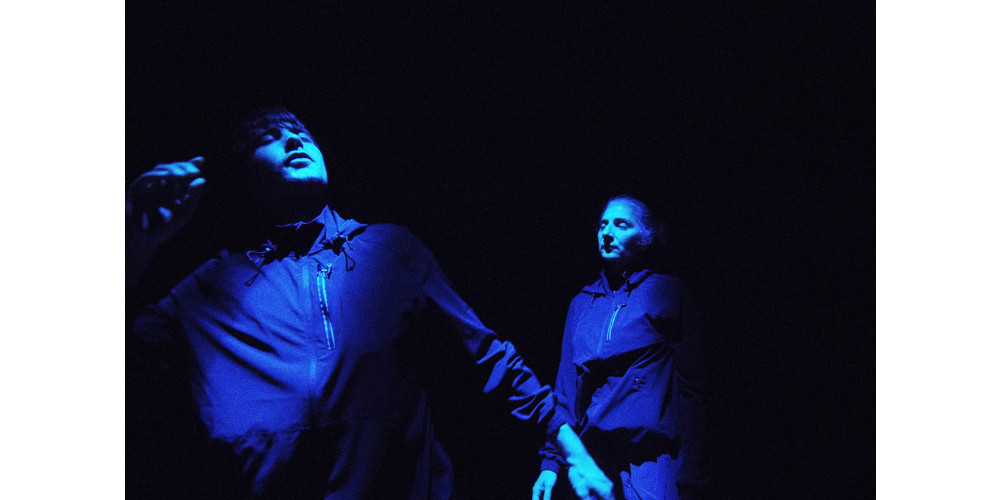 Ludger Lamers, Daniela Graça Schankula, João Santiago und Irfan Taufik bewegen sich verblüffend trittsicher durch das nächtliche Schwarz. Immer wieder tragen sie kleine Lautsprecher/Laternen vor sich her. Ihre Kleidung ist laut Programmzettel mit Sensoren und Mikrofonen bestückt. Die Interpreten der zwar lichtarmen, aber nicht farblosen Darbietung fungieren damit zugleich wie mobile Soundträger. Hie und da lassen sie kurz eine der Taschenlampen aufblitzen. Dann tauchen die Tänzer*innen wieder ab und zeigen sich an anderer Stelle erneut. Fast in der Mitte findet sich ein Paar für eine längere Sequenz zusammen: einIn-der-Umarmung-Verharren. Anderswo rollen drei Körper im Knäuel über den Boden. Verpackt in ihre schwarzen Anoraks mit Kapuzen und wintertauglich-dicken Hosen verklumpen ihre Körper im Schummerlicht wie Felsformationen in einer Landschaft.