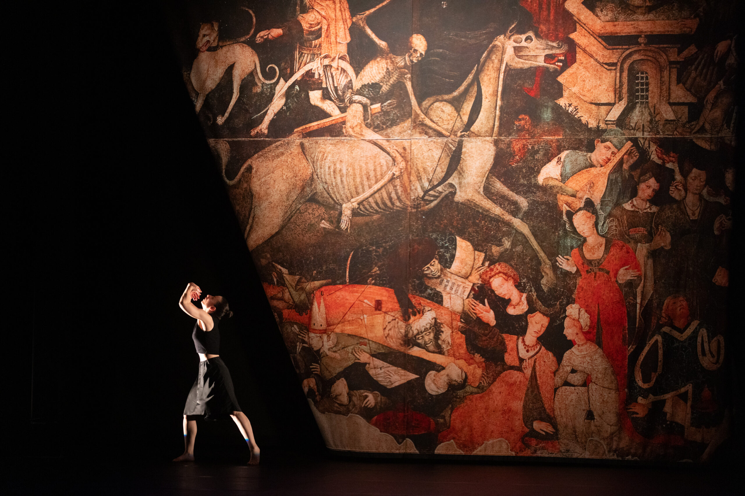 Auch der Tod ist ein Thema, das jeden von uns angeht. Doch wird er heute meistens verdrängt. Anders im Mittelalter und in der Renaissance. Hier konfrontierte man sich künstlerisch mit dem „Triumph des Todes“. So heißt auch ein sizilianisches Wandgemälde von einem unbekannten Künstler aus dem 15. Jahrhundert, das man im Palazzo Abatellis bewundern kann. Oder in der Inszenierung „invisibili“ von Aurélien Bory, wo es als riesige Stoffbahn über die ganze Bühne gespannt ist. Der Franzose lässt einzelne Szenen des Freskos, auf dem ein klapperdürrer Tod auf einem klapperdürren Pferd durch eine Menschenmenge pflügt, wie unter dem Brennglas von einem Tänzer und vier Tänzerinnen nachstellen. Hier betet eine junge Frau, dort fleht ein alter Mann oder lenkt sich ein Musiker mit seinem Instrument ab. Der Sensenmann, so der Tenor des Bildes wie des Reenactments, erwischt jeden, ob jung, ob alt, ob arm, ob reich.