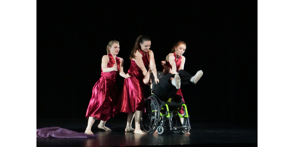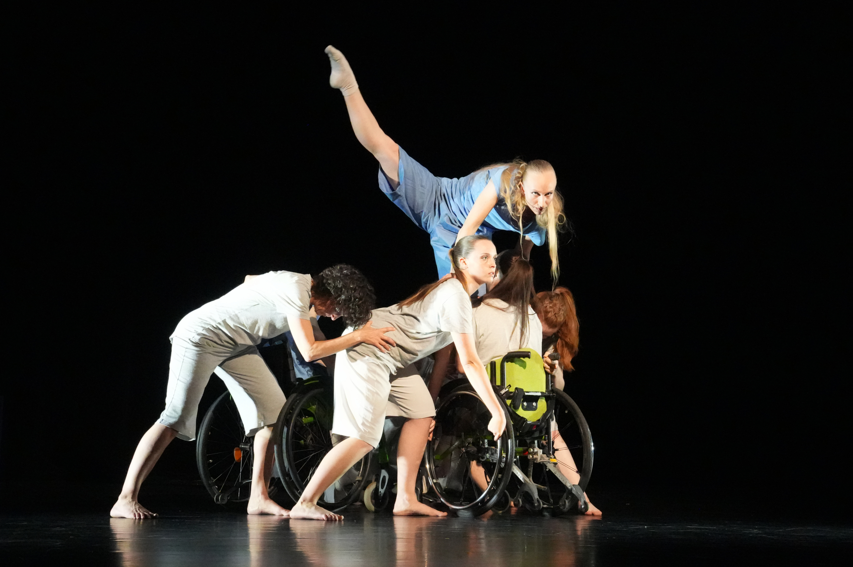 In starken Bildern beleuchtet es offen und überzeugend die Defizite, die beim Umgang zwischen Menschen mit und ohne Behinderung häufig noch vorherrschen. Mit sichtbarem Schmunzeln wird der Anspruch verdeutlicht, der seitens des Teils der Gesellschaft ohne Behinderung im Umgang mit Personen mit Behinderung an den Tag gelegt wird. Dabei geht es um Nichtbeachtung, Ausgrenzung, ebenso wie um Annäherung und Zurückweisung. Nicht nur die Perspektiven, auch die Rollen werden in „The Other Side“ gewechselt, wenn sich Performer*innen ohne Behinderung plötzlich im Rollstuhl wiederfinden und Rollifahrende aufrechtstehend mit den anderen zusammen tanzen. Einerseits bewundert man die Hartnäckigkeit und Kraft, die es kosten muss, sich aus der Komfortzone des Gefährts herausreißen und kopfüber wieder hineinfallen zu lassen. Andererseits wird man als Zusehende*r mit der Frage konfrontiert, inwieweit man sich selbst auf andere verlassen würde und möchte.