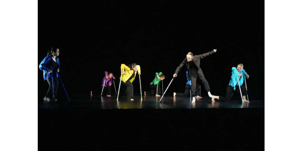 Als billiger Spott könnte das „Krückenstück“ leicht (miss-)verstanden werden, wenn gelenkige junge Frauen in quietschbunten Jacken mit eben diesen Hilfsmitteln herumalbern, einknicken, stolpern und stelzen, als machten sie sich über Menschen mit Behinderungen lustig. Zusammen mit den gehbehinderten Tanzenden wird daraus ein faszinierendes kleines Lehrstückchen über Krücken als Waffe, Spiel- oder Werkzeug und natürlich – Stütze. Durchaus auch im übertragenen Sinn, greifen wir doch oft genug auch geistig und emotional auf Krücken zurück. Den Ausklang bildet eine köstliche Parodie auf die Konsumgesellschaft mit ihren glanzvollen Versprechungen.