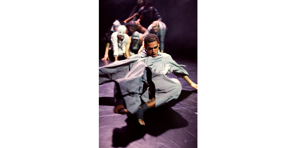 Choreografisch beeindruckt, wie sie über den Boden schlurfen, sich hinter herabhängenden Stoff- und geschlitzten Plastikbahnen herumdrücken, voreinander fliehen und in Duos aneinander geraten – ab und an akrobatisch und kampfkunsttauglich spektakulär. Sogar ein Brüllen ist mitinszeniert: Der größte unter den Tänzern zwingt den Rest der Truppe damit in die Knie. Kurz darauf wird er von unten herauf von vielen Händen begrapscht und verschwindet inmitten der ihn umringenden Körper.