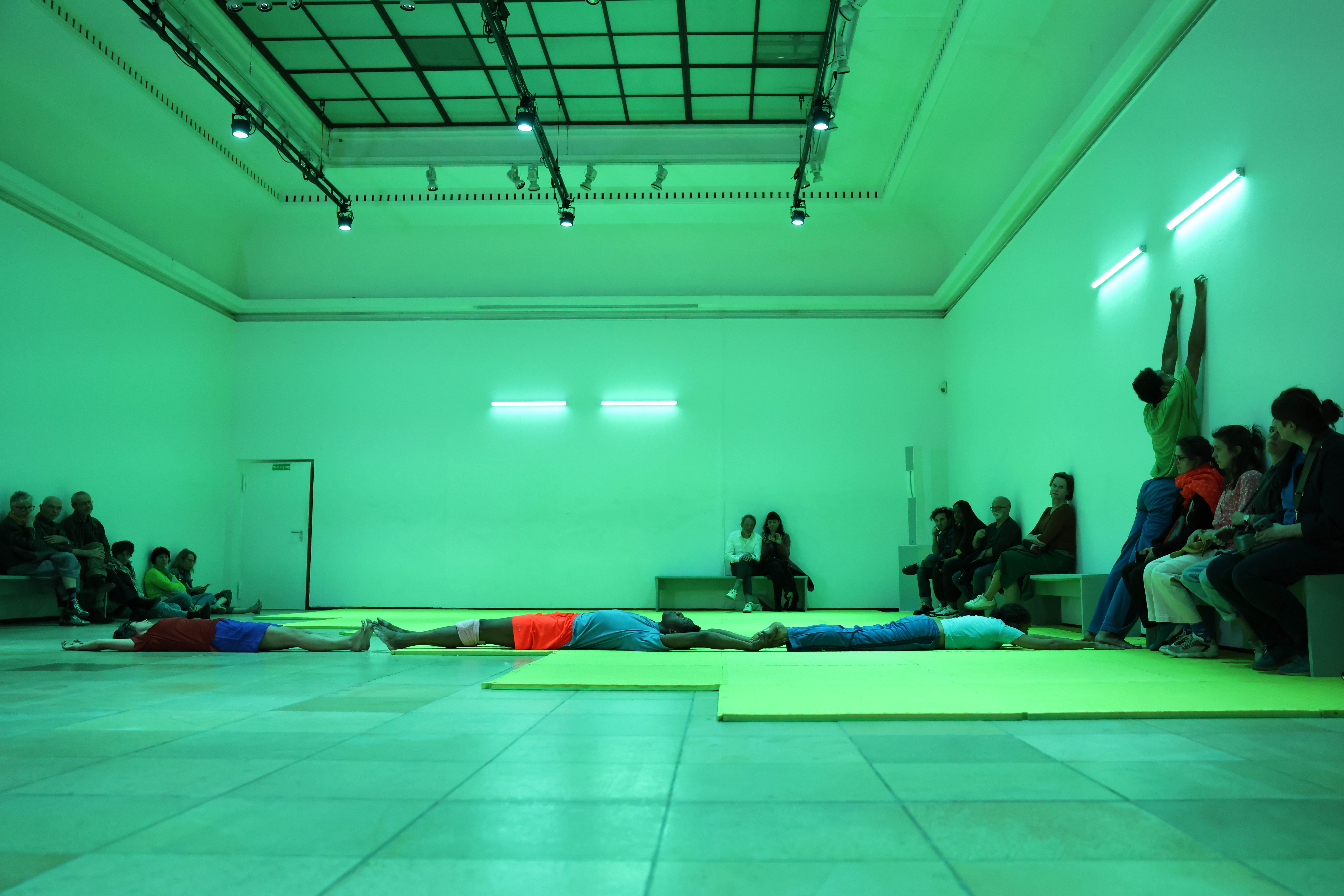 Ein Moment der Nähe: Ligia Lewis liegt auf dem Boden, die Hand ausgestreckt. Eine Zuschauerin nimmt sie vorsichtig, fast zögerlich. Was bedeutet diese Geste? Darf man sie halten? Wie tief geht diese Verbindung?