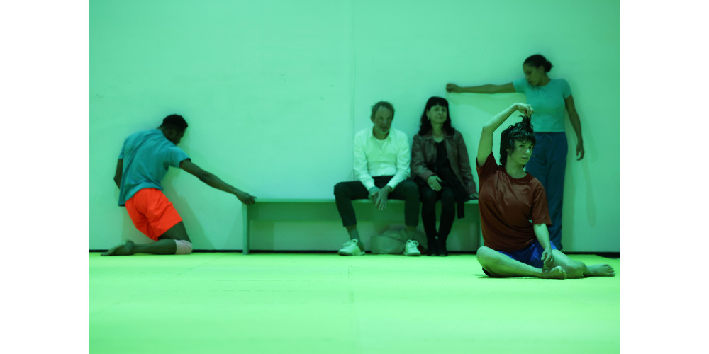 Zu Beginn bewegen sich drei Performer*innen durch den Raum, bevor Ligia Lewis selbst als vierte hinzukommt. Ihre Gesichter sind entspannt, neutral, fast losgelöst von Emotionen. Die musikalische Begleitung ist eine wiederholende, vokale Klanglandschaft, meditativ und spannungsgeladen zugleich. Die Bewegungen wirken unstetig, manchmal zittrig oder unkontrolliert – als von einer fremden Kraft gelenkt. Die Performer*innen senden durch Blicke eine Einladung – oder eine Herausforderung? Die Nähe erzeugt Unsicherheit beim Publikum: Wie nah darf man kommen? Wird man Teil der Performance?