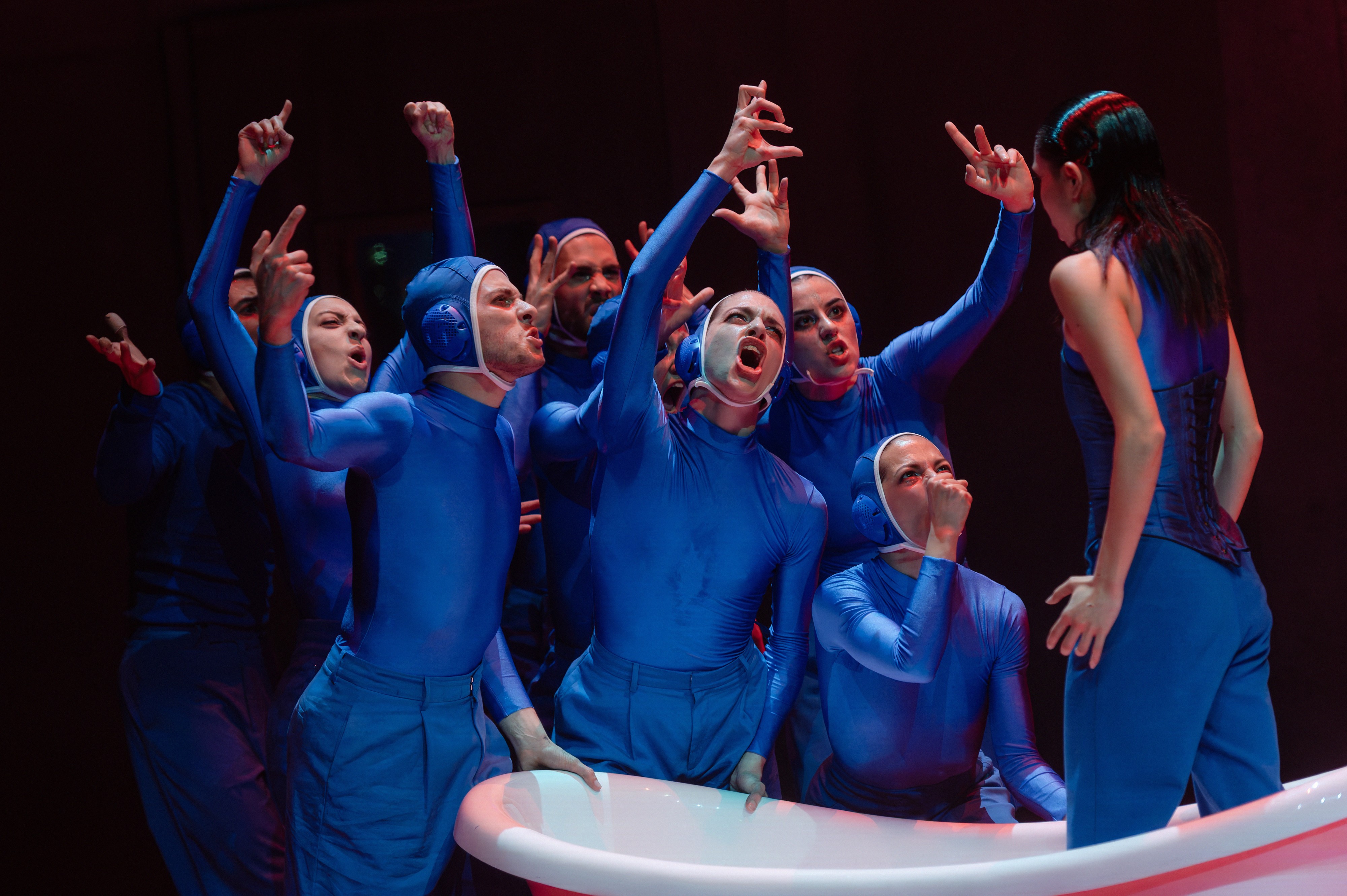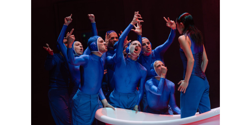 Zu Beginn schickt Alfonso López González die Tänzerin Kako Kijima zu einem psychischen Ego-Horror-Trip ins Badezimmer. Schon deren Blick in den Spiegel über dem Waschbecken im Hintergrund verrät Niedergeschlagenheit gekoppelt mit innerem Aufruhr. Ihr Versuch, Ruhe zu finden, gleicht einer Schlingerfahrt durch Stürme und Flauten. Getuschel und Geflüster erfüllt den Raum. Das Dröhnen im eigenen Kopf inszeniert González tänzerisch vortrefflich. Als die Tänzerin zum Sound einer launigen Jazztrompete in die auf dem rot beleuchteten Tanzboden stehende Wanne steigen will, formieren sich sogleich ganz in blaue Trikots mit Badehauben gekleidete Wesen schier wasserstrahlartig zu einem gallertartigen Mehrfach-Gegenüber. Dieses schwappt bald mit in die Wanne und kippt diese später mitsamt der darin Badenden um. Die Interpretin, von der Gruppe umspült, wird mal zärtlich gerahmt oder mit krallenden Händen stumm angebrüllt, was das Chaos guter und schlechter Gedanken in Kopf sehr anschaulich in all seinen schnell wechselnden Schattierungen widerspiegelt.