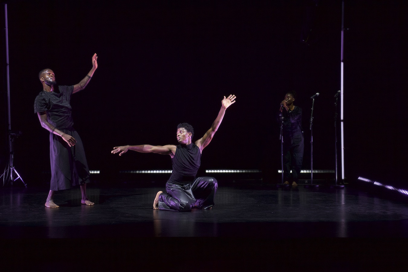 Aus der Dunkelheit schälen sich Michael Kaddu und Oluwafemi Israel Adebajo heraus. Zu Trip-Hop-ähnlichen Klängen beginnen sich die schwarzgekleideten Tänzer zu bewegen. Kaddu geht in die Hocke, lässt seinen Kopf vor- und zurückschnellen, während Adebajo rhythmisch auf den Boden stampft. Hinter ihnen eine große 3D-Projektion: Ein Tänzer, der in einer Landschaft steht, die an Caspar David Friedrichs „Eismeer“-Gemälde erinnert, und mit Schneeschichten regelrecht zugewuchert ist. Wenn er sich bewegt, meint man ein Maschinenwesen zu sehen, das aus der Filmserie „Transformers“ stammen könnte. Nur eben aus Eis und Schnee statt aus Metall.
