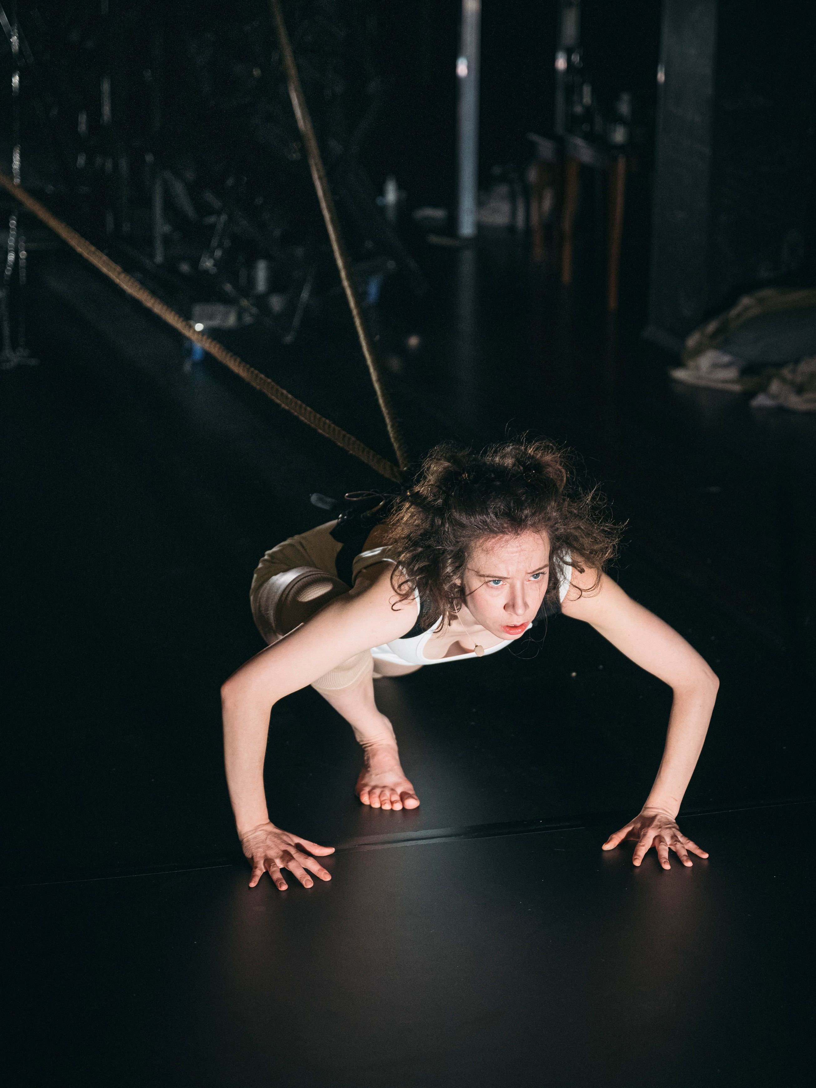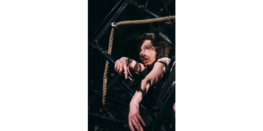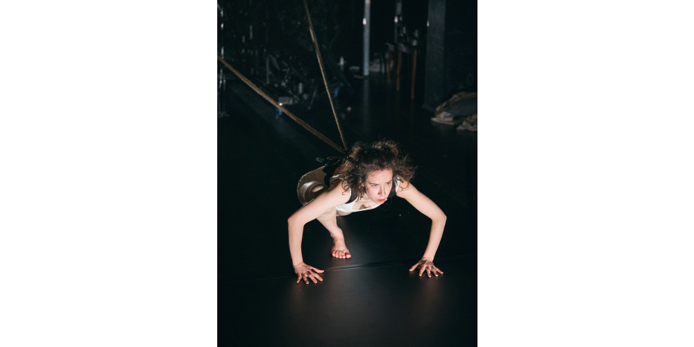 Die zweite Antwort ist ein sprechendes Bild: Ein wilder Berg aus zerbrochenen Stühlen erhebt sich am einen Ende einer 13 Meter langen Tanzboden-Bahn. Zwei Seile führen von ihm zu einem dicken Brust-Bauch-Gurt um Hornungs Körper. Der ist leicht vorgeneigt, die Arme hat sie seitlich abgespreizt. Und noch regt sich vorerst nichts zwischen diesem zarten menschlichen Zugpferd und der Last, die es zu bewegen gilt. Nach einer Stunde – denn genau so lange dauert das Stück – wird der Stuhlberg trotzdem am anderen Ende der Bahn angekommen sein. Hornung wird auf Hände und Knie gegangen sein und mehrere Crashes demonstriert haben, wie man die Zusammenbrüche nennt, die an ME/CFS, Long-Covid oder Post-Vac erkrankte Menschen oft nach jeder Minimalanstrengung erleben. Frühstücken - Crash, Duschen - Crash, Gemüseschneiden - Crash. Und jedesmal stürzt sie zu Boden.