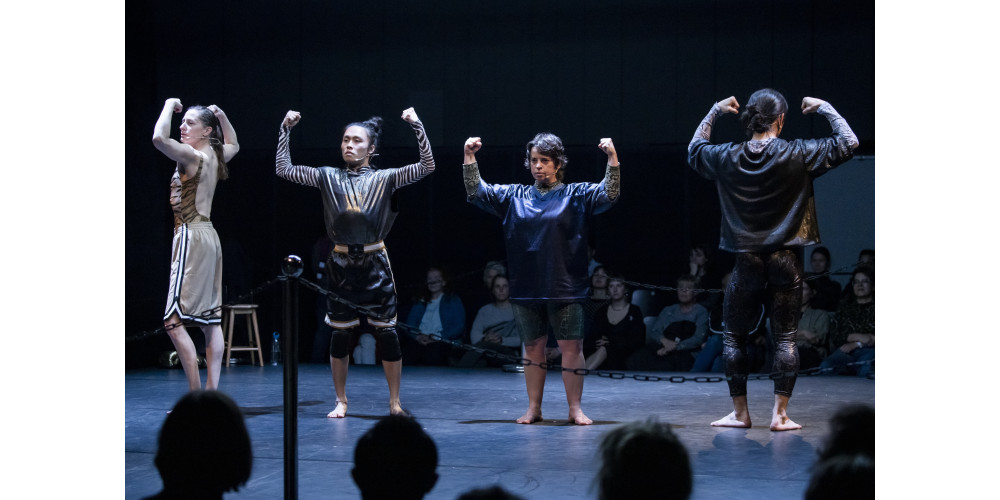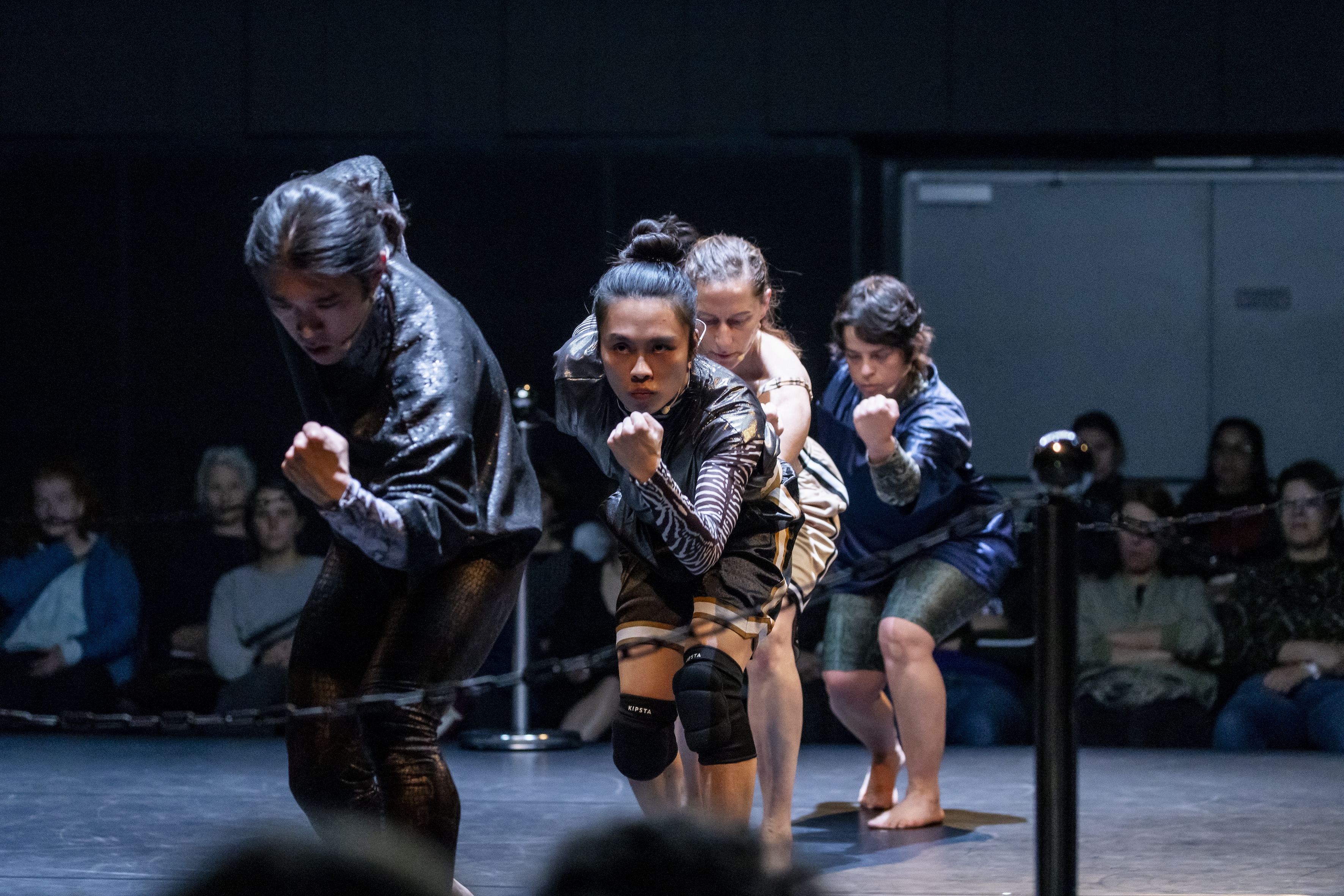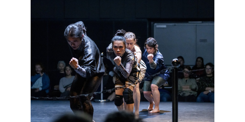 Den ästhetischen Linien ihrer vergangenen Arbeiten folgend, sucht „The Fight Club“ nach körperlichen Ausdrucksformen des Protests und findet sie hier in Kampfästhetiken, insbesondere dem männlich assoziierten Boxen. Das Publikum im schwere reiter sitzt auf vier Tribünen verteilt um den mit Ketten abgesteckten quadratischen Boxring. Die vier Performer*innen Hikaru Osakabe, Clarissa Rêgo, Cary Shiu und Zufit Simon betreten den Ring mit strammem Schritt und bedrohlicher Miene. In regelmäßigen Achterschritten tigern sie hin und her, markieren ihr Revier, stellen das performative Posen als elementaren Bestandteil vor einem Boxkampf aus. Geometrische Muster verschieben sich, gewinnen durch den Stimmeinsatz an Intensität, bis schließlich alle vier als sich gefährlich behauptende Crew über die Bühne bewegen.