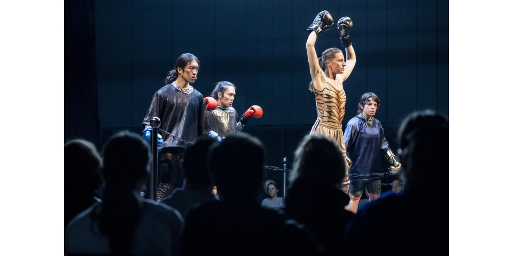 Dass es sich um eine Zufit Simon-Produktion handelt, wird direkt in der ersten Szene klar. Der rhythmische Stimmeinsatz, anfangs synchron, dann sich in komplexer werdenden Patterns überlagernd, begleitet das unaufhörliche Auf- und Abgehen der Performer*innen durch den abgesteckten Boxring und lässt sofort Erinnerungen an Simons „Radical Cheerleading“ auftauchen. In gewisser Weise ist die neue Arbeit der in München und Berlin arbeitenden Choreografin direkt mit ihrer Erfolgsproduktion, die ihr zahlreiche Auszeichnungen wie den Münchner Tanzpreis und Einladungen auf Gastspiele bescherte, verbunden. 2024 wurde „Radical Cheerleading“ mit dem Festivalpreis des Best OFF Festivals Freier Theater Niedersachsen ausgezeichnet. Der Preis war eine 30.000€ Produktionsförderung für „The Fight Club“, das Zufit Simon nun vergangene Woche beim Best OFF Festival in Hannover zur Uraufführung brachte.