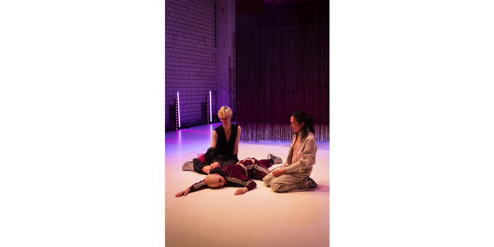 Bisher dachte man bei den in München und Hamburg arbeitenden Rykena/Jüngst an ein Choreografie-Duo, das auch immer gemeinsam auf der Bühne steht. Für „Stripping Bolero“ verließ Carolin Jüngst nun erstmals die Position auf der Bühne und überließ sie neben Lisa Rykena dem Tänzer Raymond Liew Jin Pin und dem Performer Emil Leske. Einerseits ist es mehr als einleuchtend, dass angesichts des immensen Aufwands in der Komposition der verschiedenen Ebenen im Probenprozess ein Blick von außen im essenziell war, andererseits wirkt „Stripping Bolero“ dadurch auch wie der künstlerisch logische Fortschritt in eine neue, größere Phase von Rykena/Jüngst.