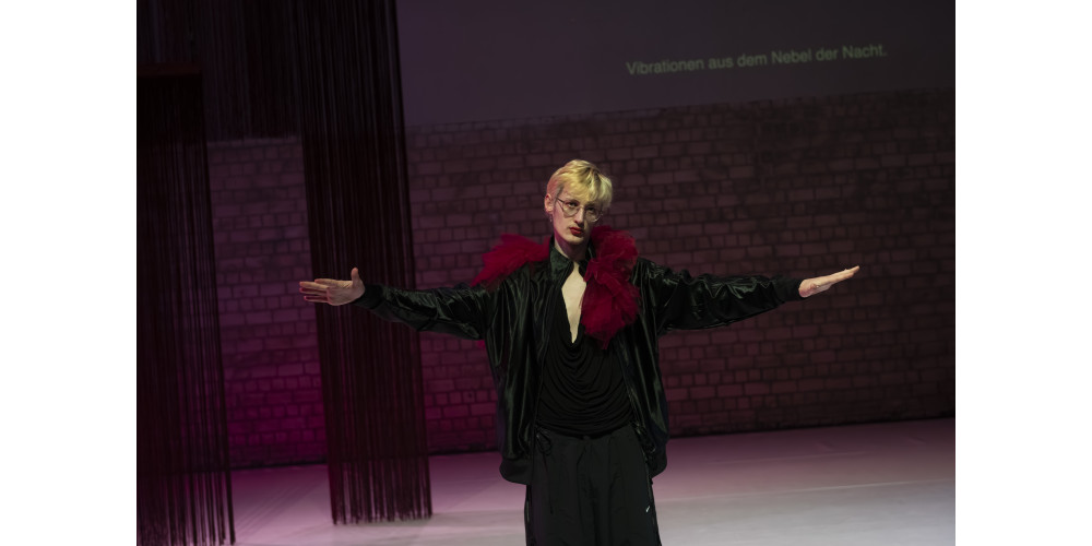 Anders als in vielen tänzerischen Interpretationen dient Ravels „Bolero“ nicht der musikalisch-rhythmischen Untermalung des Tanzes. Vielmehr übertragen Rykena/Jüngst dessen musikalische Prinzipien des langsam-stetigen Anschwellens bis zur ekstatischen Entladung auf eine inhaltliche Beschäftigung mit dem Prinzip des Höhepunkts. Beziehungsweise geht es bisweilen v.a. um den Moment vor einer Klimax, bevor sich die aufgeladene Spannung entlädt. Vielschichtige Assoziationen werden performativ und sprachlich durch den Raum geworfen. Referenzen aus der Popkultur wie der existenziellen Wahl zwischen der roten und blauen Pille in Matrix überlagern sich mit märchenhaften Erzählungen, Mythen. Sexuelle Ekstase bricht durch die Beschreibung des letzten körperlichen Aufbäumens vor dem Tod. Die hochkomische Hetzjagd, in der sich die Performenden und die Audiodeskriptionsstimme gegenseitig anstacheln und wie in einer Zeitschleife Bewegungen und „Anweisungen“ immer wieder von vorn beginnen, entlädt sich in plötzlicher Stille, Bedrohlichkeit.